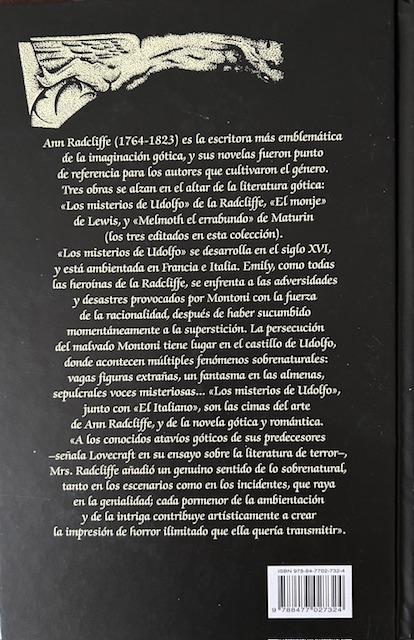 Tres obras se alzan en el altar de la literatura gótica: «Los misterios de Udolfo» de la Radcliffe, «El monje» de Lewis, y «Melmoth el errabundo» de Maturin (los tres editados en esta colección).