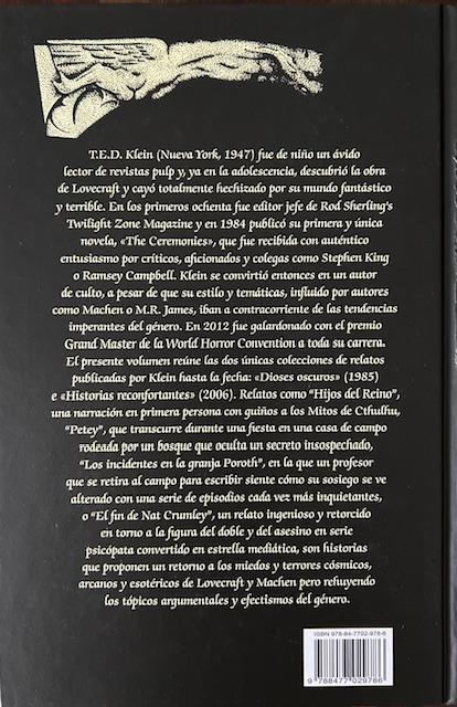 El presente volumen reúne las dos únicas colecciones de relatos publicadas por Klein hasta la fecha: «Dioses oscuros» (1985) e «Historias reconfortantes» (2006). Relatos como «Hijos del Reino», una narración en primera persona con guiños a los Mitos de Cthulhu, «Petey», que transcurre durante una fiesta en una casa de campo rodeada por un bosque que oculta un secreto insospechado, «Los incidentes en la granja Poroth», en la que un profesor que se retira al campo para escribir siente cómo su sosiego se ve alterado con una serie de episodios cada vez más inquietantes, o «El fin de Nat Crumley», un relato ingenioso y retorcido en torno a la figura del doble y del asesino en serie psicópata convertido en estrella mediática, son historias que proponen un retorno a los miedos y terrores cósmicos, arcanos y esotéricos de Lovecraft y Machen pero rehuyendo los tópicos argumentales y efectismos del género.