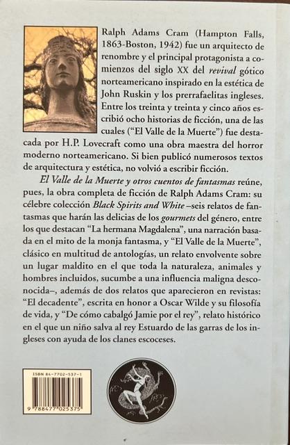 El Valle de la Muerte y otros cuentos de fantasmas reúne, pues, la obra completa de ficción de Ralph Adams Cram: su célebre colección Black Spirits and White –seis relatos de fantasmas que harán las delicias de los gourmets del género, entre los que destacan La hermana Magdalena, una narración basada en el mito de la monja fantasma, y El Valle de la Muerte, clásico en multitud de antologías, un relato envolvente sobre un lugar maldito en el que toda la naturaleza, animales y hombres incluidos, sucumbe a una influencia maligna desconocida–, además de dos relatos que aparecieron en revistas: El decadente, escrita en honor a Oscar Wilde y su filosofía de vida, y De cómo cabalgó Jamie por el rey, relato histórico en el que un niño salva al rey Estuardo de las garras de los ingleses con ayuda de los clanes escoceses.