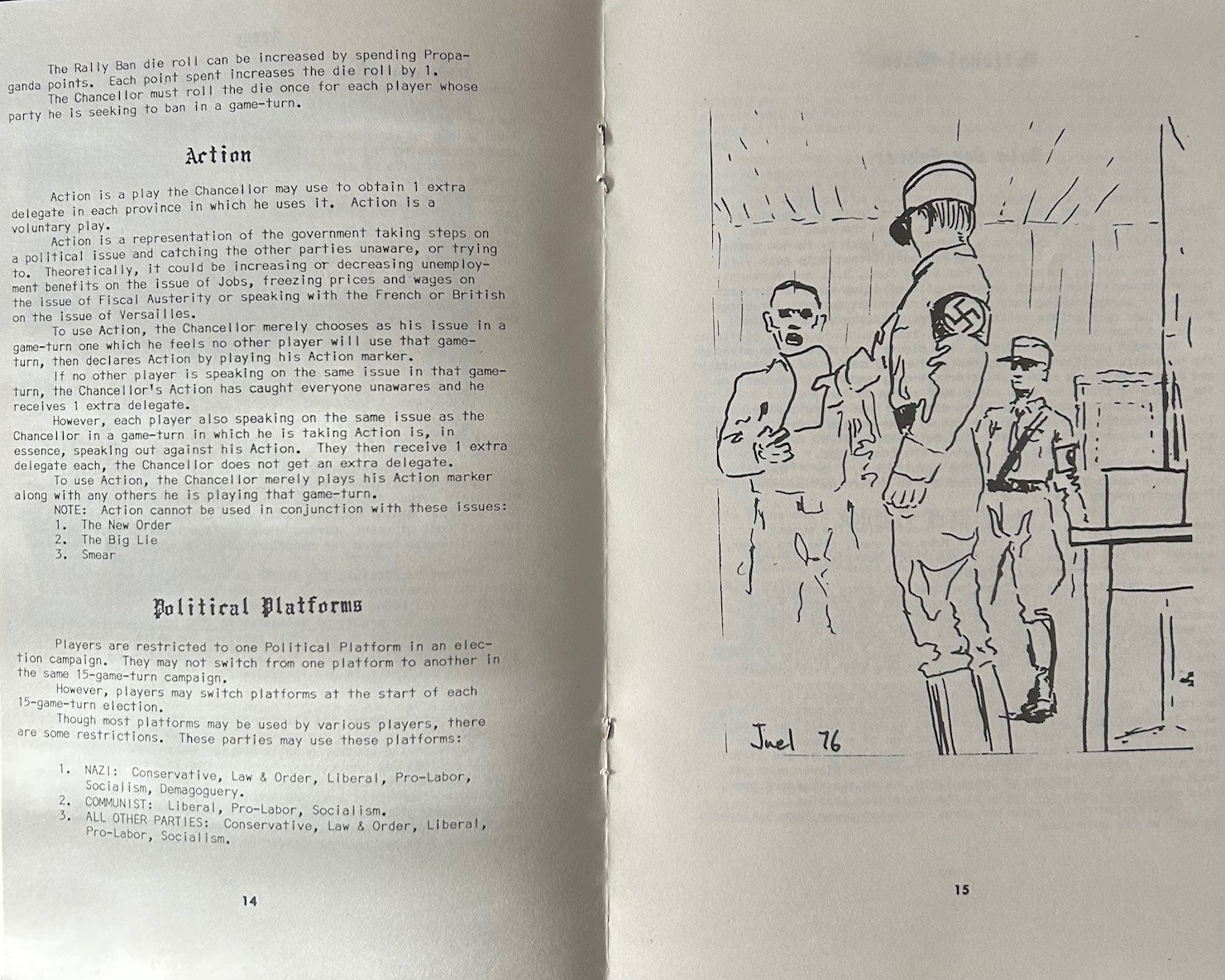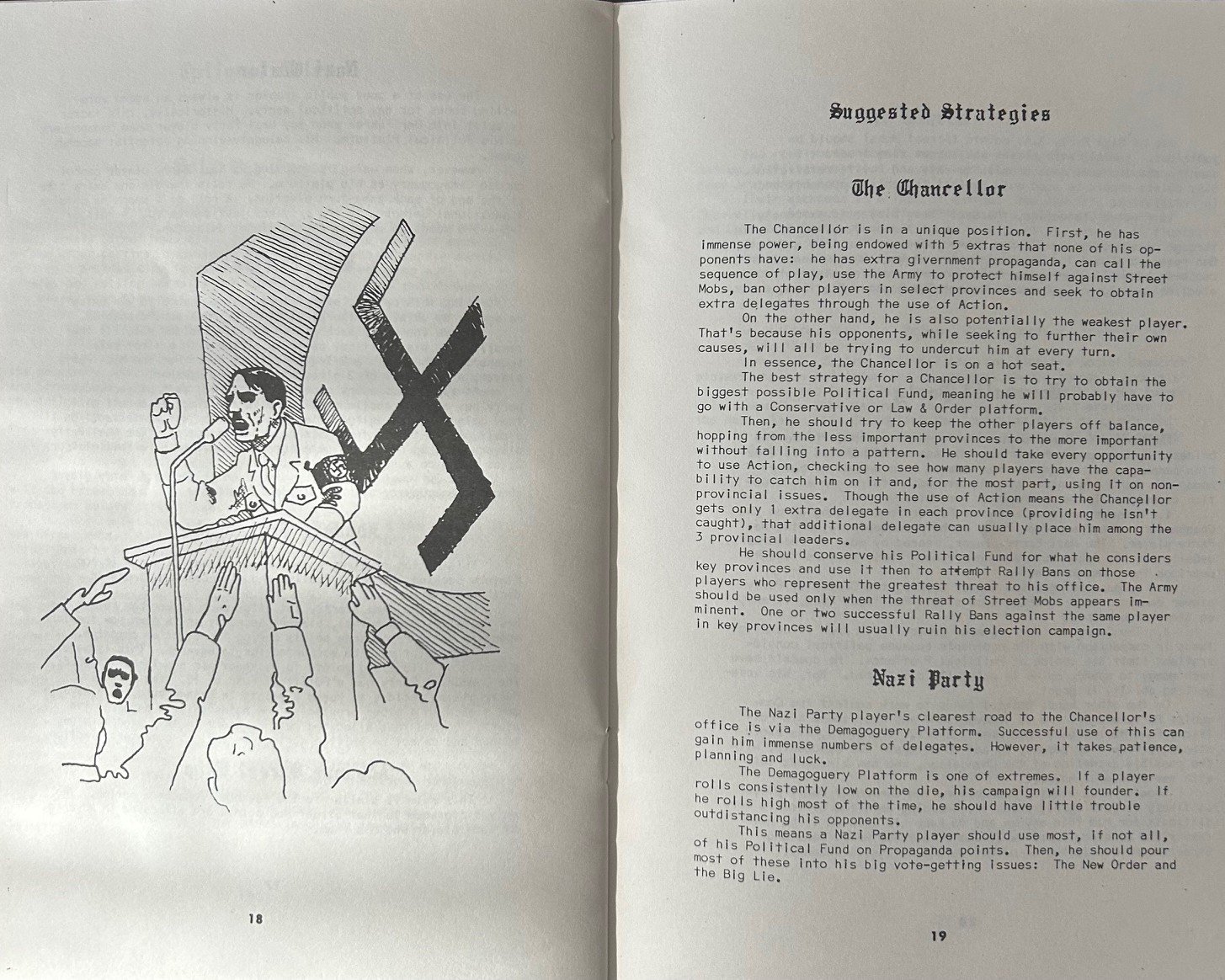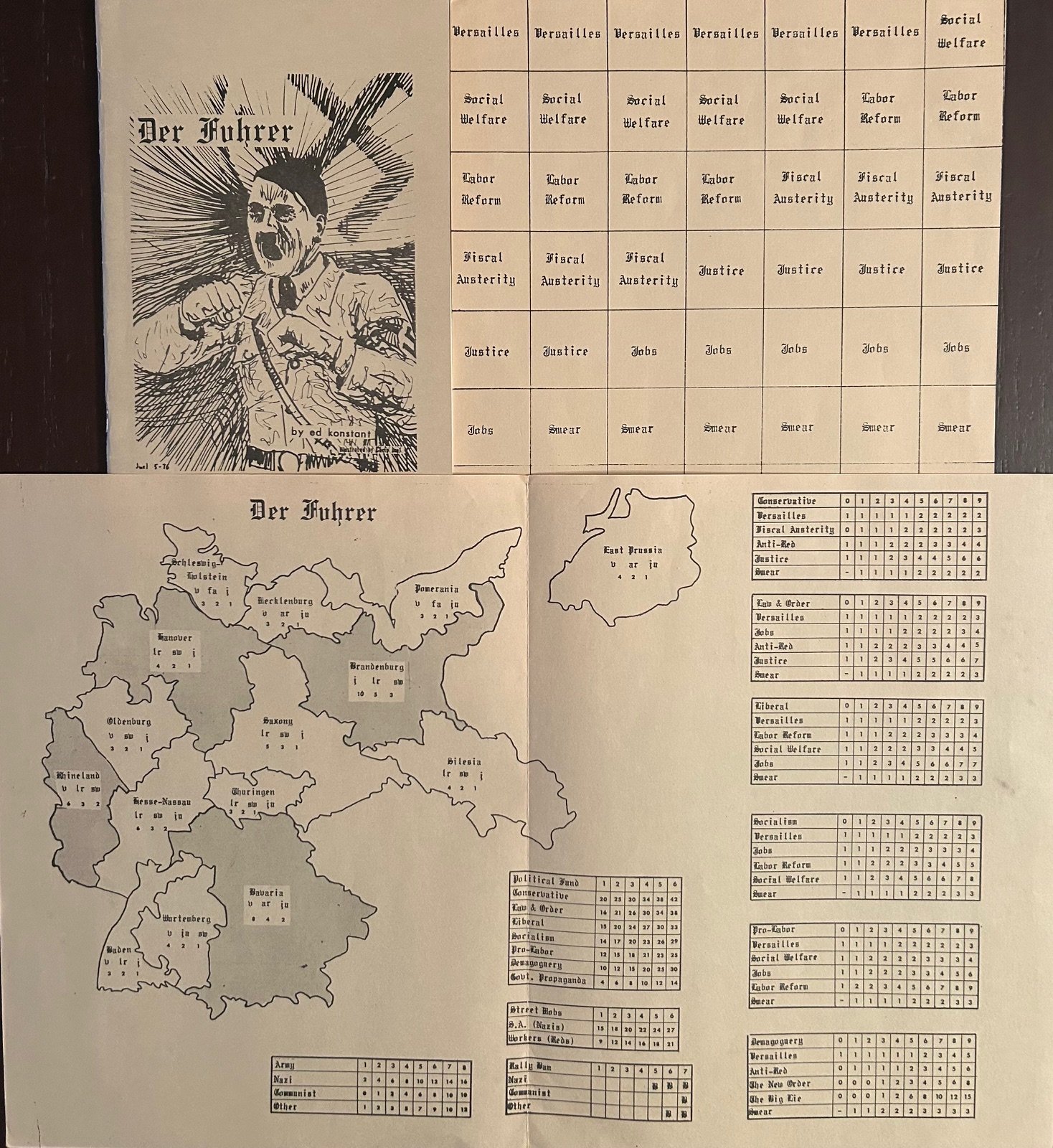 Recuperamos en este artículo a un precursor del más reciente "Weimar: la lucha por la democracia". Se trata de un divertido y ameno juego político con trasfondo en las elecciones de marzo de 1933 que auparon al partido nazi al poder en Alemania, "DER FUHRER", publicado en 1976, obra de Ed Konstant, cofundador de un pequeño sello, Little Soldier Games, cuyo pequeño catálogo absorbió Phoenix Games en 1978 hasta su desaparición en 1981.