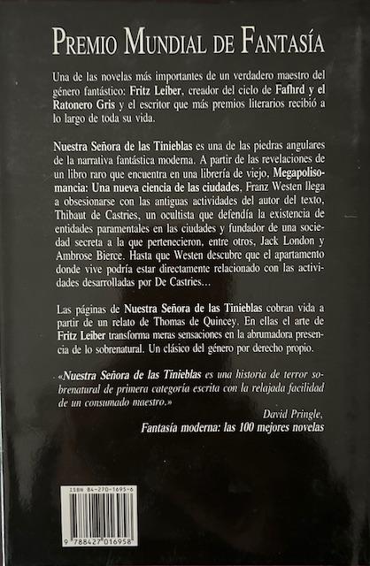Una de las novelas más importantes de un verdadero maestro del género fantástico: Fritz Leiber, creador del ciclo de Fafhrd y el Ratonero Gris y el escritor que más premios literarios recibió a lo largo de toda su vida. "Nuestra Señora de las Tinieblas" es una de las piedras angulares de la narrativa fantástica moderna, una historia de terror sobrenatural de primera categoría escrita con la relajada facilidad de un consumado maestro.
