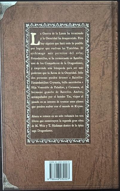 La Guerra de la Lanza ha terminado y la Oscuridad ha desaparecido. Pero Raistlin emprenderá una búsqueda para ser más poderoso que la Reina de la Oscuridad y hará todo lo posible por lograr que vuelvan las Tinieblas. Sólo dos personas pueden detenerlo: Crysania, bella sacerdotisa e Hija Venerable de Paladine, y Caramon, el hermano gemelo de Raistlin. Ambos, acompañados por el kender Tas, viajan al pasado para truncar unos planes que pueden acabar con el mundo de Krynn.