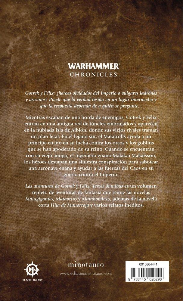 Las aventuras de Gotrek y Félix. Tercer ómnibus es un volumen repleto de aventuras de fantasía que reúne las novelas Matagigantes, Mataorcos y Matahombres, además de la novela corta Hija de Manorroja y varios relatos inéditos.