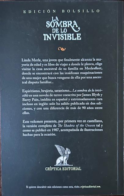 Espiritismo, brujería, satanismo... La Sombra de lo Invisible es una novela de terror coescrita por James Blyth y Barry Pain, inédita en español y extremadamente rara incluso en inglés: solo ha salido publicada en dos ediciones, y con una diferencia de más de 90 años entre ellas.
