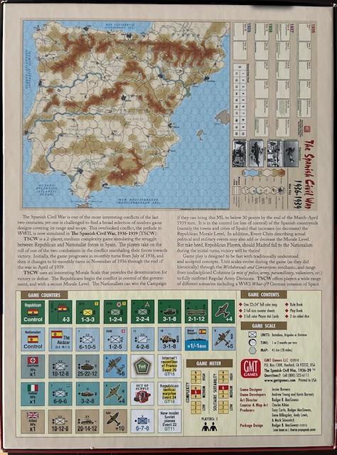 "The Spanish Civil War 1936-1939" de GMT Games es un wargame para 2 jugadores, de complejidad media, que simula la lucha entre Republicanos y Nacionalistas en España. Los jugadores asumen el papel de uno de los dos combatientes en el conflicto para dirigir sus fuerzas hacia la victoria. Inicialmente, el juego progresa en turnos mensuales desde julio de 1936 y cambia a turnos bimensuales en noviembre de 1936 hasta el final de la guerra.