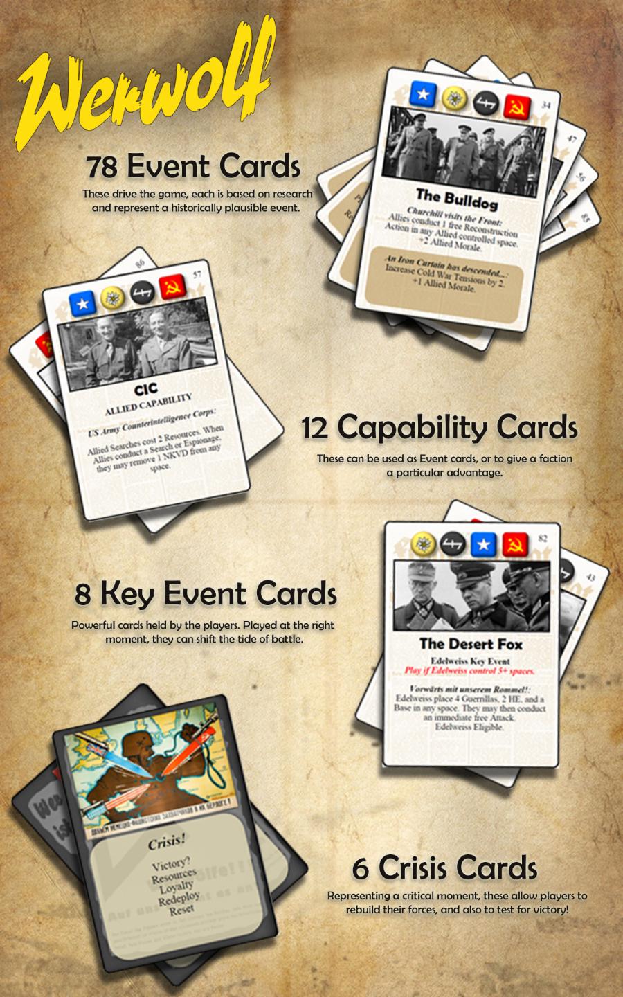 Inspirado en la serie COIN, Werwolf: Insurgency in Occupied Germany, 1945 - 1948 es un juego de guerra de tablero de nivel estratégico de historia alternativa asimétrico para 1 a 4 jugadores.