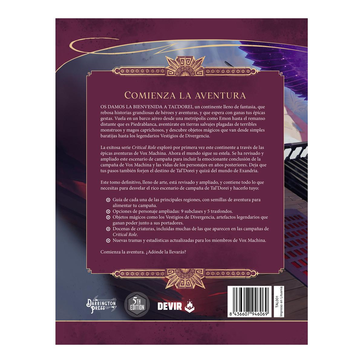 Este tomo definitivo, lleno de arte, está revisado y ampliado, y contiene todo lo que necesitas para desvelar el rico escenario de campaña de Tal’Dorei y hacerlo tuyo: