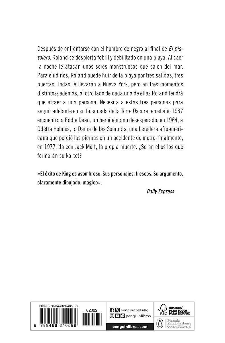Después de enfrentarse con el hombre de negro al final de El pistolero, Roland se despierta febril y debilitado en una playa. Al caer la noche le atacan unos seres monstruosos que salen del mar. Para eludirlos, Roland puede huir de la playa por tres salidas, tres puertas. Todas le llevarán a Nueva York, pero en tres momentos distintos; además, al otro lado de cada una de ellas Roland tendrá que atraer a una persona.