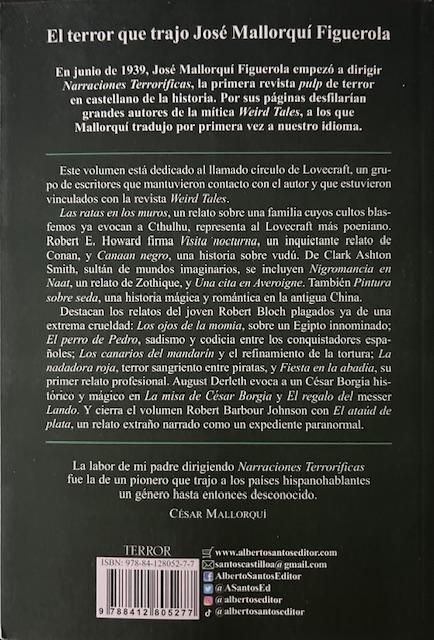 El terror que trajo José Mallorquí Figuerola, el autor de El Coyote, el gigante de la cultura popular española, dirigiendo la revista Narraciones Terroríficas para Editorial Molino Argentina desde 1939 a 1943, cuando terminó la Guerra Civil y comenzaba la II Guerra Mundial. Realizó las primeras traducciones en el mundo de Lovecraft y sus colaboradores: R.E. Howard, creador de Conan, August Derleth, Robert Bloch, el creador de Psicosis, Clark Ashton Smith..., directamente de la revista original donde fueron publicados, Weird Tales. Estos autores crearon el terror cósmico y el terror moderno, pero no fueron recuperados hasta las décadas de los cincuenta y sesenta.