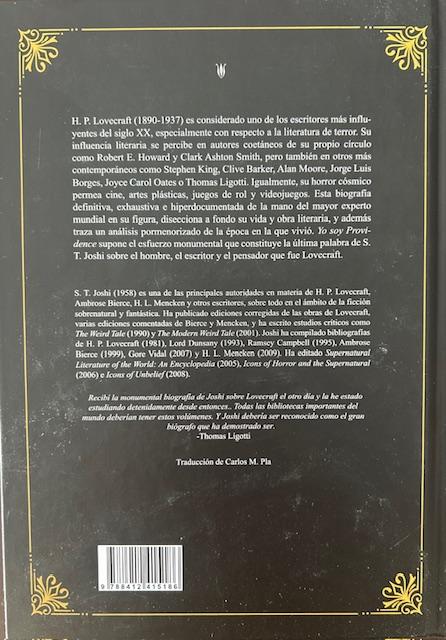 "Yo soy Providence" supone el esfuerzo monumental que constituye la última palabra de S.T. Joshi sobre el hombre, el escritor y el pensador que fue Lovecraft. Esta biografía definitiva, exhaustiva e hiper documentada de la mano del mayor experto mundial en su figura, disecciona a fondo su vida y obra literaria, y además traza un análisis pormenorizado de la época en la que vivió.