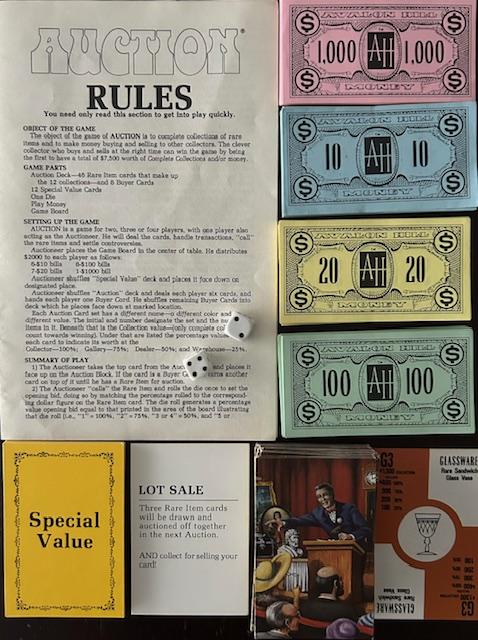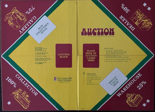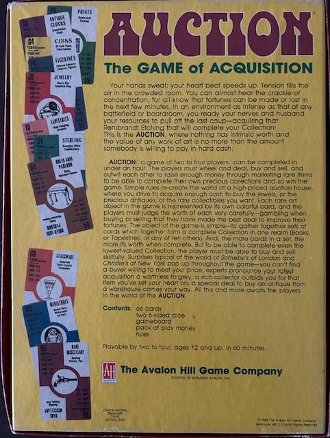 Los jugadores representan en AUCTION a coleccionistas que intentan reunir conjuntos de valiosas propiedades y objetos: monedas, antigüedades, miniaturas, etc. Estos conjuntos alcanzan un valor considerable al final de la partida. Las piezas individuales de un conjunto no tienen valor al final de la partida, pero pueden venderse durante el juego para obtener ingresos.