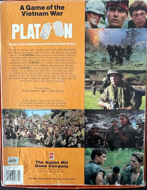 Platoon es un wargame sencillo sobre combates de pequeños escuadrones en Vietnam. Es similar a los juegos de la serie Smithsonian de Avalon Hill: una hoja con las reglas básicas y un folleto con reglas avanzadas, escenarios adicionales e información histórica. El sistema de combate también es similar al de otros juegos de la serie Smithsonian.