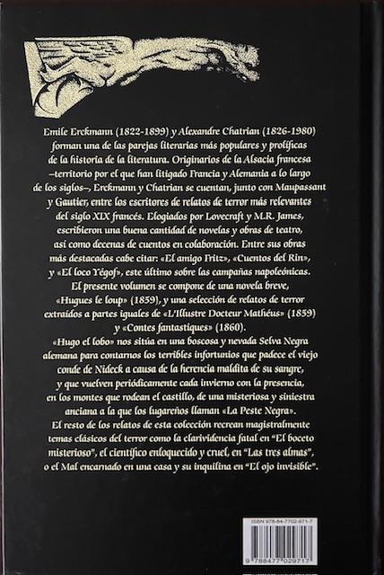 «Hugo el lobo» nos sitúa en una boscosa y nevada Selva Negra alemana para contarnos los terribles infortunios que padece el viejo conde de Nideck a causa de la herencia maldita de su sangre, y que vuelven periódicamente cada invierno con la presencia, en los montes que rodean el castillo, de una misteriosa y siniestra anciana a la que los lugareños llaman «La Peste Negra». El resto de los relatos de esta colección recrean magistralmente temas clásicos del terror.
