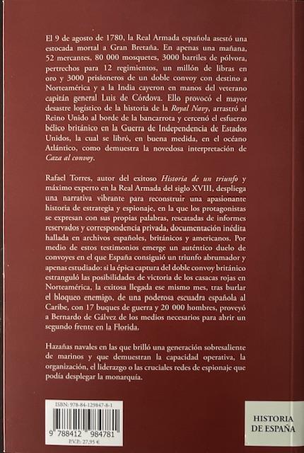 Rafael Torres, autor del exitoso Historia de un triunfo y máximo experto en la Real Armada del siglo XVIII, despliega una narrativa vibrante para reconstruir en Caza al convoy una apasionante historia de estrategia y espionaje, en la que sus protagonistas se expresan con sus propias palabras, rescatadas de informes reservados y correspondencia privada, documentación inédita encontrada en archivos españoles, ingleses y americanos. A través de estos testimonios emerge un auténtico duelo de convoyes en el que España consiguió un triunfo abrumador y apenas estudiado: si la épica captura del doble convoy británico estranguló las posibilidades de victoria de los casacas rojas en Norteamérica, la exitosa llegada ese mismo mes, burlando el bloqueo enemigo, de una poderosa escuadra española al Caribe, con diecisiete buques de guerra y veinte mil hombres, proveería a Bernardo de Gálvez de los medios necesarios para abrir un segundo frente en la Florida. Hazañas navales en las que brilló una generación sobresaliente de marinos y que demuestran la capacidad operativa, la organización, el liderazgo o las cruciales redes de espionaje que podía desplegar la monarquía.