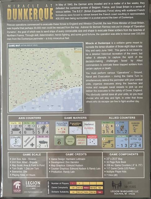Miracle at Dunkerque es un juego para un solo jugador diseñado para recrear la tensa situación que se vivió en el perímetro de Dunkerque durante los últimos ocho días de mayo y junio de 1940. El juego busca capturar la esencia de las difíciles decisiones que enfrentaron los comandantes aliados al intentar rescatar a los restos del último ejército británico de una muerte segura. Las Cartas de Evento, basadas en hechos históricos, impulsan la acción y crean diversas circunstancias en cada turno. Las fuerzas alemanas sitiadoras (ejército, fuerza aérea y naval) están controladas por estas cartas, diseñadas específicamente para ejercer una presión constante sobre el jugador. Las Acciones del Jugador Aliado deben asignarse en cada turno para la defensa del perímetro, la creación de unidades de evacuados y el embarque de estos desde las playas y los muelles a los barcos disponibles, para luego zarpar hacia la seguridad de Inglaterra. Obviamente, no se puede salvar a todas las unidades aliadas, por lo que es necesario elegir quién se queda a luchar y quién intenta escapar para continuar la lucha contra los nazis otro día.