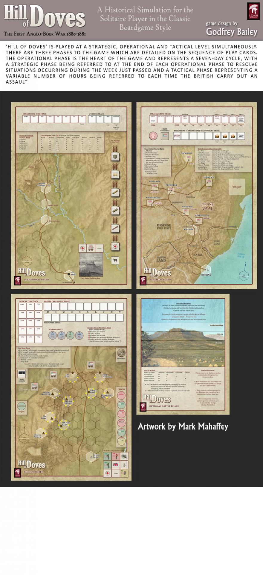 «Hill of Doves» se juega simultáneamente en tres tableros: el tablero estratégico, el tablero operativo y el tablero táctico. La información de la partida se registra en estos tableros, y las columnas estratégicas, operativas y tácticas británicas se despliegan sobre los mapas que estos tableros representan.