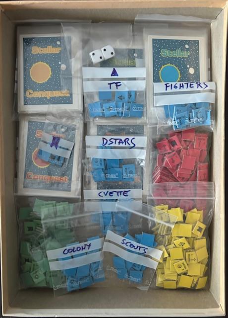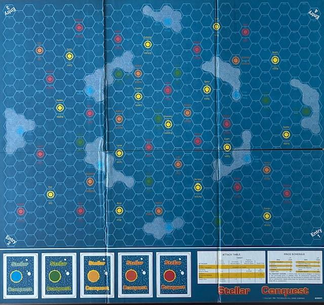 Cada jugador comienza en una esquina opuesta del tablero, cada una con un número de marcadores que representan naves de diversos tipos. Durante los primeros cuatro turnos, la casilla de la esquina cuenta como un planeta poblado. Además, todas las naves solo pueden moverse dos casillas, pero es posible adquirir mejoras de movimiento que aumentan la velocidad de desplazamiento. Las unidades deben seguir la ruta más rápida a un destino designado, y este solo puede cambiarse cuando la ruta hace que la unidad se detenga en un hexágono estrella. La distancia que pueden recorrer las naves de cualquier tipo no puede exceder más de ocho hexágonos de un planeta poblado propiedad del mismo jugador; esta limitación puede eliminarse mediante investigación. Los puntos de investigación deben invertirse en unidades militares (naves que pueden atacar a otras naves) antes de que puedan construirse. Si una unidad no militar de un jugador, sin estar acompañada por una unidad militar, aterriza en una estrella que aún no ha explorado, debe lanzar un dado y se destruye con un 1. Cuando la pieza de un jugador cae sobre una estrella, su capacidad para sustentar vida se determina aleatoriamente; la probabilidad de éxito depende del color de la estrella. Las mejoras pueden aumentar la capacidad de un planeta para sustentar vida. Cada cuatro turnos se produce una "fase de producción" en la que la población planetaria aumenta en una quinta parte de su población actual. Cualquier jugador puede mover unidades de población a los CT y obtener Unidades de Producción Industrial (UII), la moneda con la que los jugadores compran mejoras y naves adicionales. La cantidad de naves con los que comienza un jugador depende de la cantidad de jugadores, el escenario y las preferencias de los jugadores.