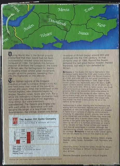 Britannia , el clásico juego de estrategia de Avalon Hill, permite a los jugadores recrear esta historia épica, recreando batallas importantes en algunos casos y alterando el curso de la historia en otros. Las reglas del juego desalientan a los jugadores a realizar movimientos históricamente irreales, pero también les dan la libertad de alterar la historia de Gran Bretaña de forma significativa, creando innumerables escenarios hipotéticos interesantes. ¿Qué habría pasado si la revuelta de Boudica contra los romanos hubiera tenido más éxito? ¿Qué habría pasado si los romanos y los romano-británicos hubieran repelido las invasiones sajonas de los siglos V y VI? ¿Qué habría pasado si Guillermo el Conquistador hubiera muerto durante la invasión normanda de 1066?