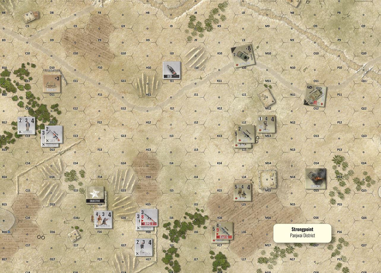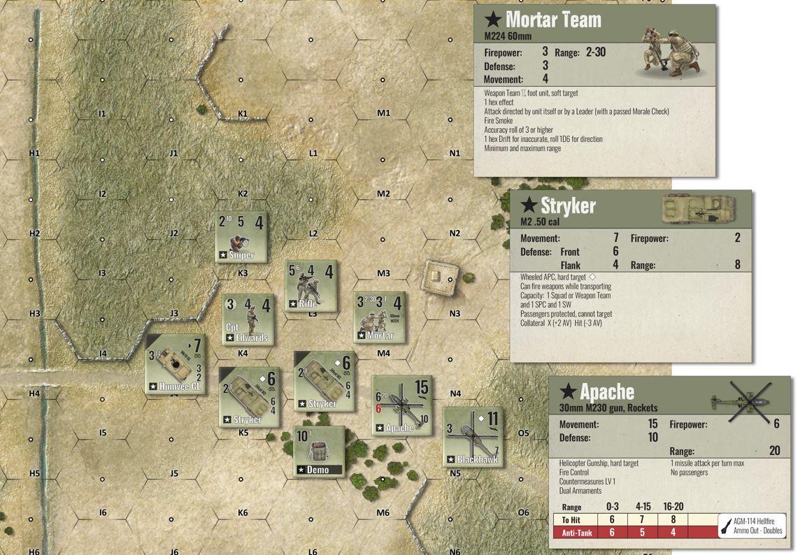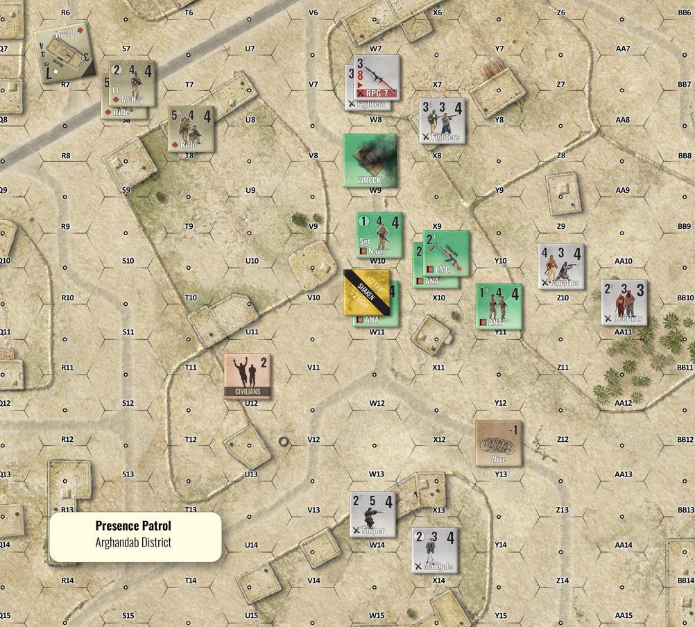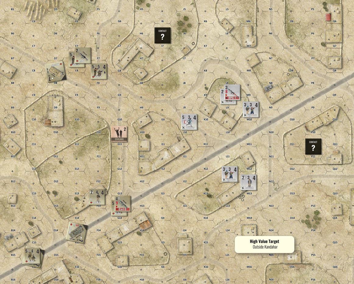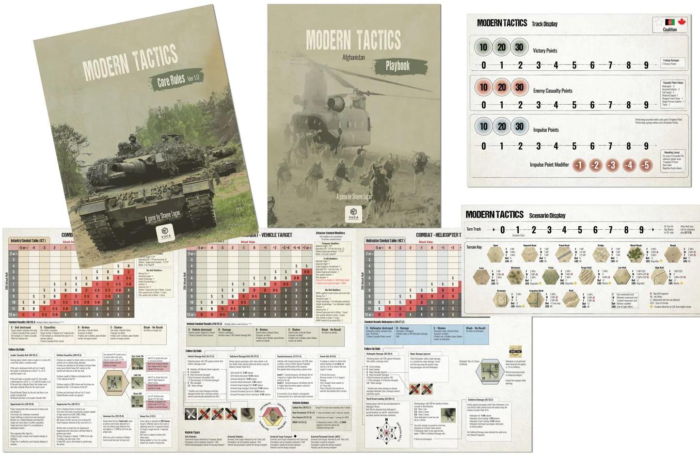 Manual de juego y escenario (Afganistán) • Reglas básicas (v1.0) • Mapas tácticos geomórficos • Fichas de coalición e insurgentes (infantería, líderes, equipos de armas, vehículos, marcadores) • Ayudas para el jugador y tablas de referencia.
