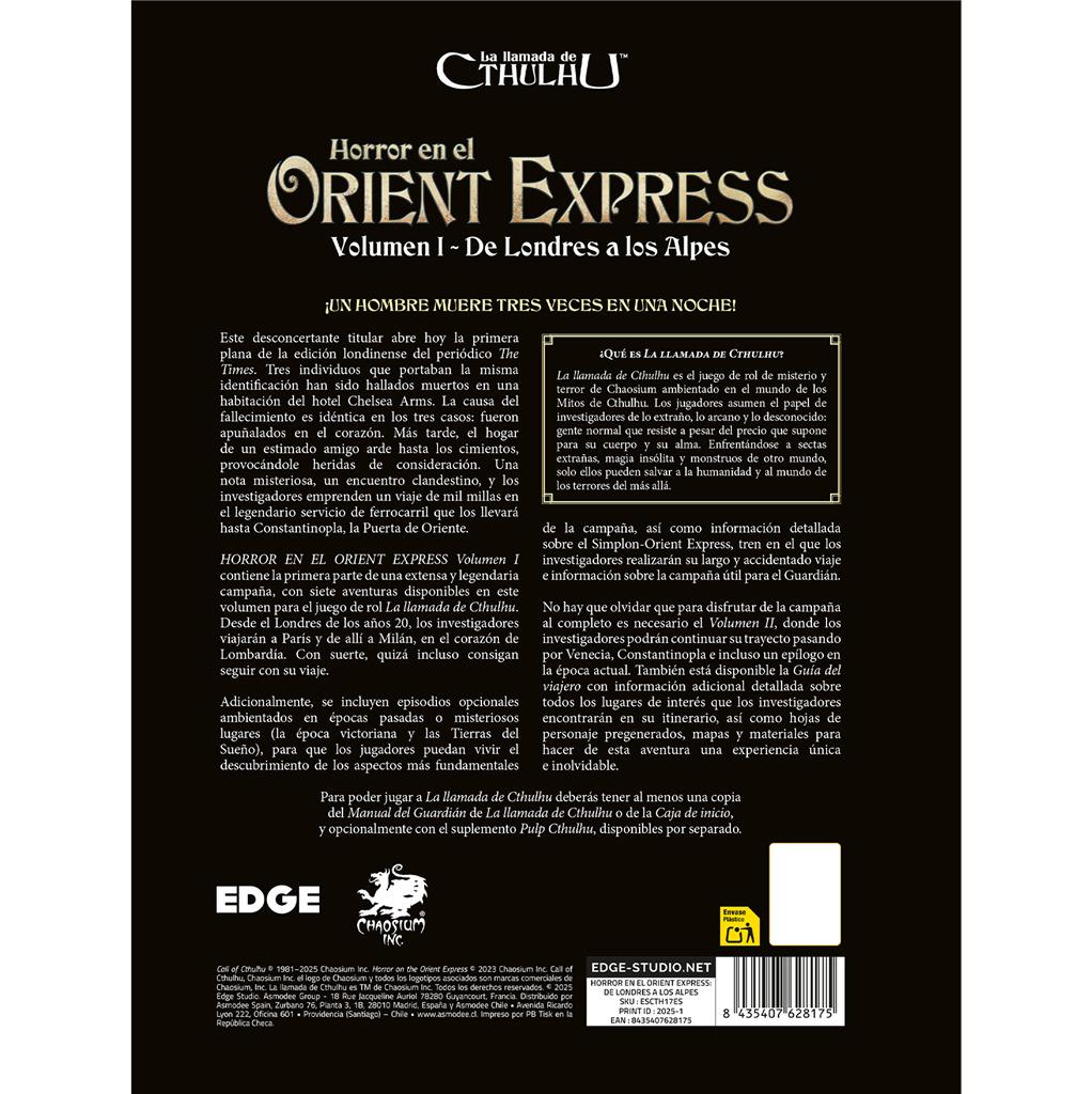 Horror en el Orient Express Volumen I contiene la primera parte de una extensa y legendaria campaña, con siete aventuras disponibles en este volumen para el juego de rol La llamada de Cthulhu. Desde el Londres de los años 20, los investigadores viajarán a París y de allí a Milán, en el corazón de Lombardía. Con suerte, quizá incluso consigan seguir con su viaje.