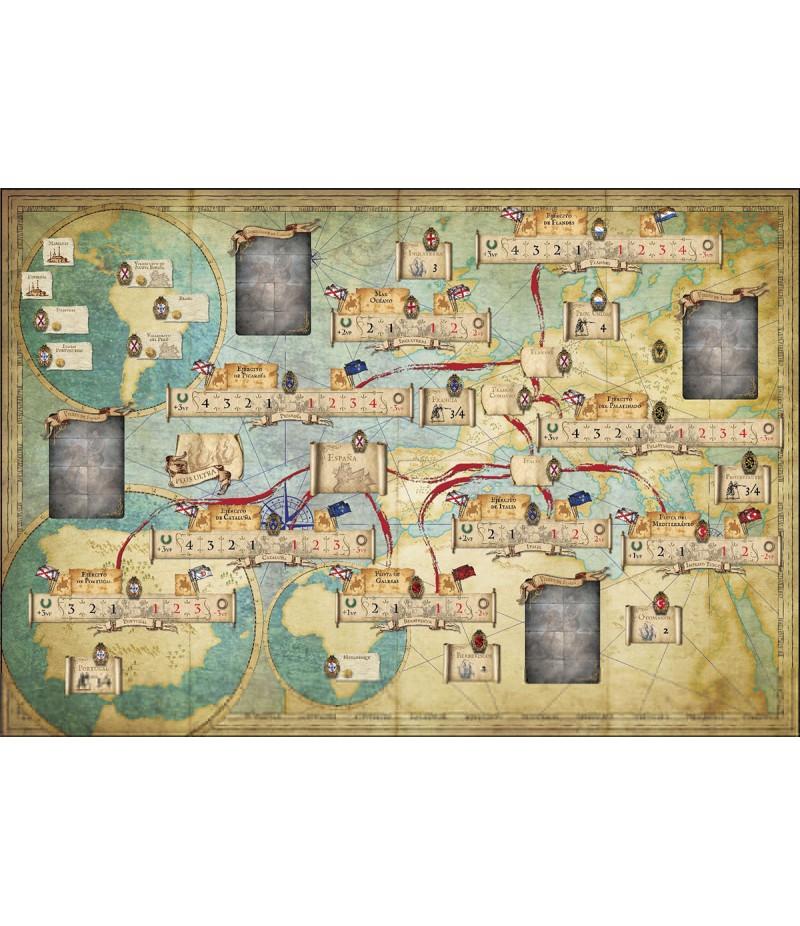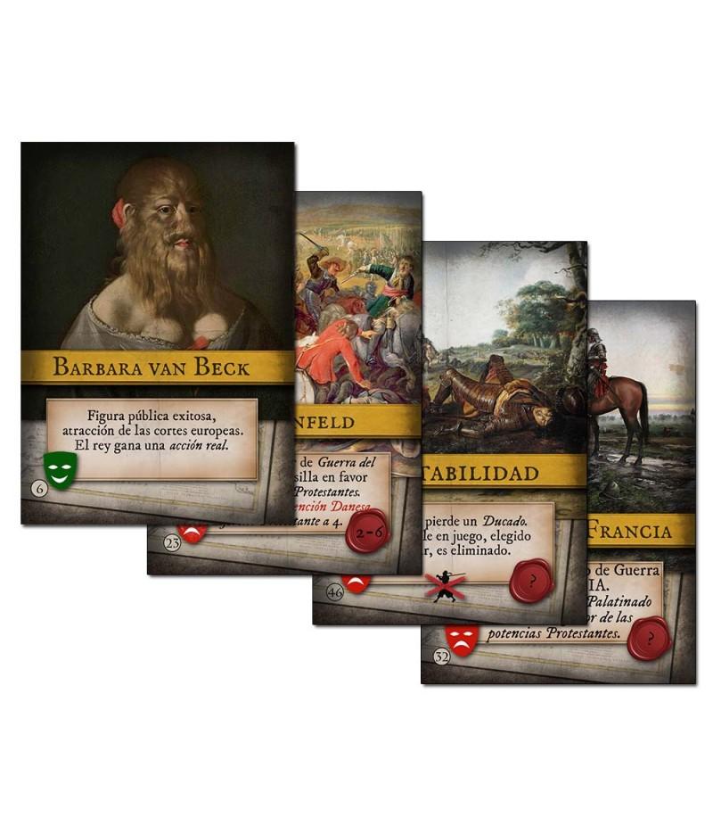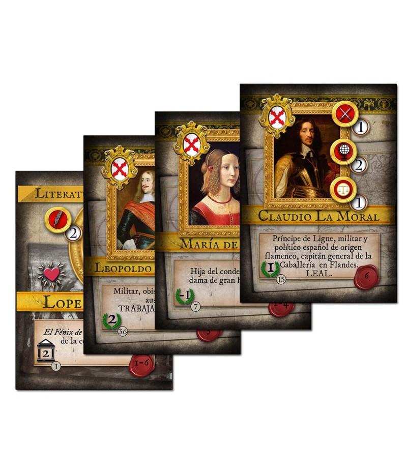 El juego es guiado mediante un mazo de cartas de eventos, representando los distintos acontecimientos de la época, desde malas cosechas a conflictos con otras potencias. A mayor número de guerras más inestable es el reino y más problemas deberá afrontar. Para el mejor gobierno del reino el jugador dispone de una serie de ilustres (personajes), divididos en tres categorías: nobles (políticos y militares), genios (artistas) y damas (reinas o damas de la corte). Cada turno representa entre 3 a 6 años de tiempo real. Existen dos escenarios introductorios de juego, dos escenarios de campaña de cuatro turnos cada uno y un escenario de campaña de ocho turnos que cubre todo el reinado de Felipe IV. El tiempo de juego de cada turno es de 1-1,5 horas cada uno. Sin embargo, siempre existe el riesgo de tener una Derrota Automática, bien porque el Prestigio de la monarquía o su nivel de Ilustración sea igual o menor a 1 punto o porque ocurra una Muerte Súbita de Felipe IV si su felicidad cae a cero. La unidad económica del juego es el ducado, equivaliendo cada uno de estos ducados a un millón de ducados del momento, al cambio actual unos 136 millones de euros.