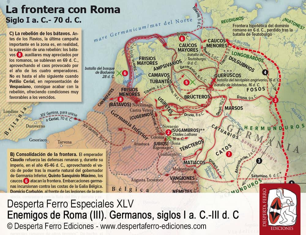 Número 45 de la colección de revistas de historia "Desperta Ferro" (DFE, Desperta Ferro Especiales), centrada en los "Enemigos de Roma III, Germanos, siglos I a. C.- III d. C. Nacidos en el complejo y cambiante crisol de la Edad del Hierro del norte de Europa, los pueblos germánicos irrumpieron por vez primera desde la Protohistoria, hacia las páginas de la Historia –al menos desde una óptica eminentemente mediterránea– de la mano de las incursiones de cimbrios y teutones, a finales del siglo II a. C., movimiento que culminó en su primer choque con el poder romano a las puertas de Italia.