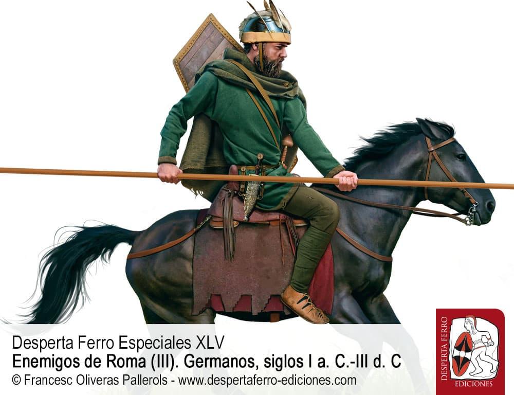 Nacidos en el complejo y cambiante crisol de la Edad del Hierro del norte de Europa, los pueblos germánicos irrumpieron por vez primera desde la Protohistoria, hacia las páginas de la Historia –al menos desde una óptica eminentemente mediterránea– de la mano de las incursiones de cimbrios y teutones, a finales del siglo II a. C., movimiento que culminó en su primer choque con el poder romano a las puertas de Italia. La posterior expansión de la hegemonía romana hasta el Rin y el Danubio durante el siglo I a. C., así como sus variadas tentativas de ir más allá entre los siglos I y II d. C., implicaron un proceso violento que puso a prueba las prácticas y formas de hacer la guerra entre los germanos, así como sus concepciones políticas, culturales y religiosas. Enfrentados a la superioridad estratégica y táctica de Roma, los pueblos germánicos supieron encontrar respuestas entre los limitados y dispares recursos a su disposición. Desde la guerra asimétrica hasta el combate en orden abierto, las huestes germánicas demostraron una sorprendente capacidad de adaptación y aprendizaje. Incluso su principal hándicap, la fragmentación política, comenzó a trocarse para dar en confederaciones cada vez más sólidas y estables, hermandades guerreras y caudillajes. Del mismo modo, de la mano de los contingentes de mercenarios, auxiliares y fuerzas de élite, enviados a militar en el Ejército Romano, los germanos acabaron por dejar también su particular y honda huella en las tradiciones militares mediterráneas.