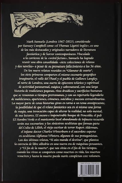 Mark Samuels, considerado por Ramsey Campbell como «el Thomas Ligotti inglés» y vinculado a la corriente de la «weird fiction», logró reunir una obra consolidada a pesar de su prematuro fallecimiento. De los nueve relatos reunidos en Glamour de osario, los siete primeros comparten el mismo escenario geográfico imaginario, el valle del Thool y el pueblo de Gallows Langley, una suerte de epicentro telúrico de actividad paranormal con tradiciones paganas que se remontan a tiempos prerromanos y con un repertorio legendario de maldiciones, apariciones, crímenes, suicidios y sucesos extraordinarios.