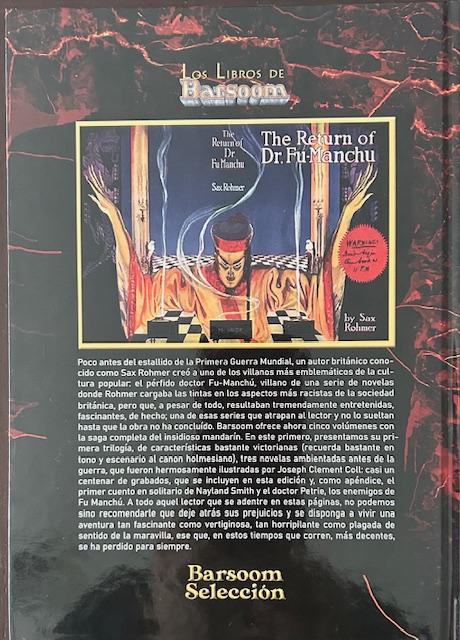 Barsoom ofrece ahora cinco volúmenes con la saga completa del insidioso mandarín. En este primero, presentamos su primera trilogía, de características bastante victorianas (recuerda bastante en tono y escenario al canon holmesiano), tres novelas ambientadas antes de la guerra, que fueron hermosamente ilustradas por Joseph Clement Coll: casi un centenar de grabados, que se incluyen en esta edición y, como apéndice, el primer cuento en solitario de Nayland Smith y el doctor Petrie, los enemigos de Fu-Manchú.