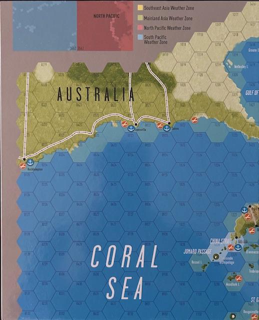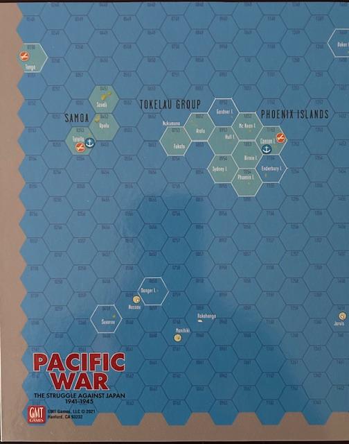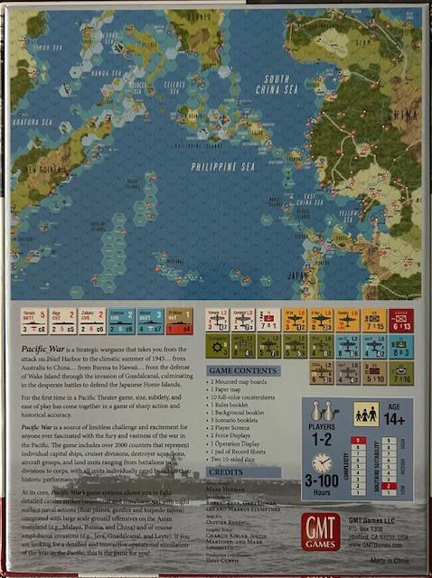 El mapa del juego es un mapa de área equivalente (dos mapas montados) al de Empire of the Sun. Cada hexágono mide representa 160 kilómetros y cubre todo el Pacífico, desde Hawái hasta la India y desde Alaska hasta Australia. El juego también incluye un mapa independiente centrado en las Islas Salomón, donde se desarrollan muchos de los escenarios más interesantes y equilibrados. Lo que hizo único al PACIFIC WAR de Victory Games en 1985 sigue vigente en esta edición de GMT. El diseño integra inteligencia estratégica y operativa en una mecánica de tiempo telescópico que permite que las campañas progresen con un flujo asimétrico lógico, acompañado de una jugabilidad intensa.