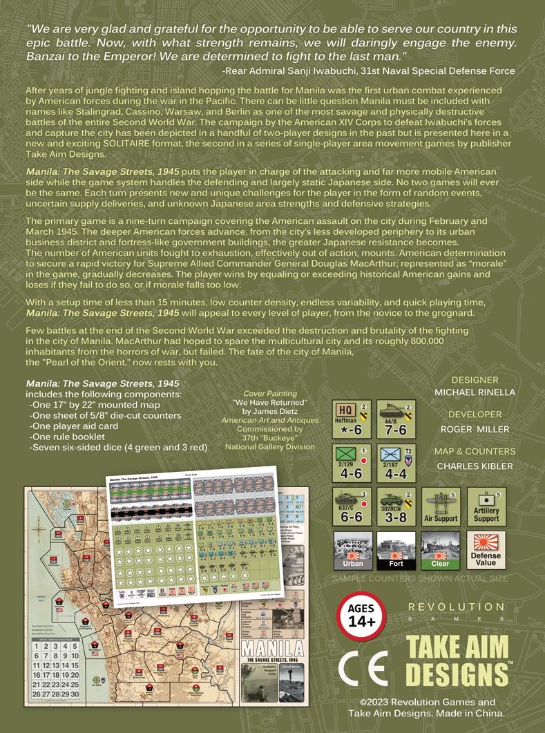 Tras años de combates en la jungla y de isla en isla, la batalla de Manila fue el primer combate urbano que experimentaron las fuerzas estadounidenses durante la guerra del Pacífico. La campaña del XIV Cuerpo estadounidense para derrotar a las fuerzas de Iwabuchi y capturar la ciudad se ha representado en varios diseños para dos jugadores, pero aquí se presenta en un nuevo y emocionante formato SOLITARIO, el segundo de una serie de juegos de movimiento por áreas para un solo jugador de la editorial Take Aim Designs.
