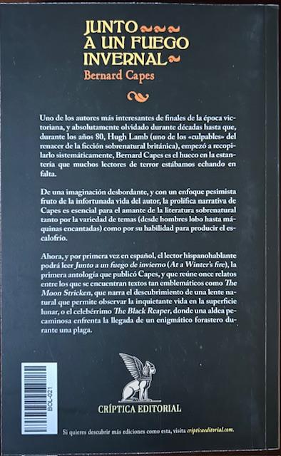 Ahora, y por primera vez en español, el lector hispanohablante podrá leer "Junto a un fuego invernal" (At a Winter´s fire), la primera antología que publicó Capes, y que reúne once relatos entre los que se encuentran textos tan emblemáticos como "The Moon Stricken", que narra el descubrimiento de una lente natural que permite observar la inquietante vida en la superficie lunar, o el celebérrimo "The Black Reaper", donde una aldea pecaminosa enfrenta la llegada de un enigmático forastero durante una plaga.