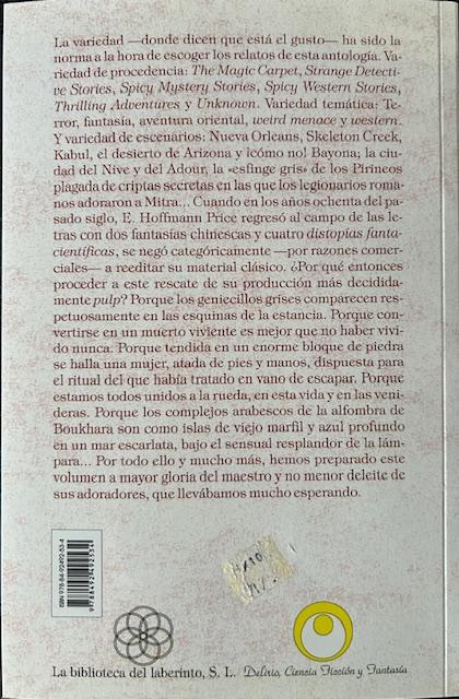 E. Hoffmann Price (1898-1988) fue un prolífico autor que cultivó una amplia gama de géneros populares —incluyendo la ciencia ficción, el terror, el crimen y la fantasía—, aunque su producción más conocida y celebrada son sus narraciones de aventuras en ambientes orientales. La variedad —donde dicen que está el gusto— ha sido la norma a la hora de escoger los relatos de esta antología, de procedencia, temática y de escenarios. Un volumen a mayor gloria del maestro y no menor deleite de sus adoradores, que llevábamos mucho esperando.