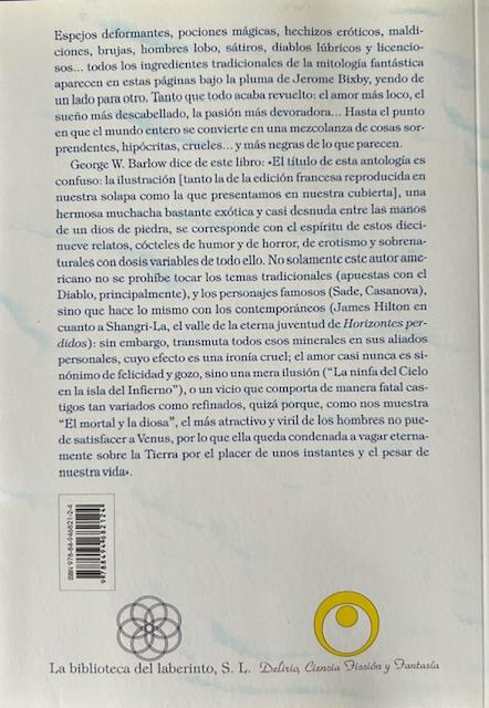 George W. Barlow dice de este libro: «El título de esta antología es confuso: la ilustración [tanto la de la edición francesa reproducida en nuestra solapa como la que presentamos en nuestra cubierta], una hermosa muchacha bastante exótica y casi desnuda entre las manos de un dios de piedra, se corresponde con el espíritu de estos diecinueve relatos, cócteles de humor y de horror, de erotismo y sobrenaturales con dosis variables de todo ello. No solamente este autor americano no se prohíbe tocar los temas tradicionales (apuestas con el Diablo, principalmente), y los personajes famosos (Sade, Casanova), sino que hace lo mismo con los contemporáneos (James Hilton en cuanto a Shangri-La, el valle de la eterna juventud de Horizontes Perdidos): sin embargo, transmuta todos esos minerales en sus aliados personales, cuyo efecto es una ironía cruel; el amor casi nunca es sinónimo de felicidad y gozo, sino una mera ilusión (“La ninfa del Cielo en la isla del Infierno”), o un vicio que comporta de manera fatal castigos tan variados como refinados, quizá porque, como nos muestra “El mortal y la diosa”, el más atractivo y viril de los hombres no puede satisfacer a Venus, por lo que ella queda condenada a vagar eternamente sobre la Tierra por el placer de unos instantes y el pesar de nuestra vida».