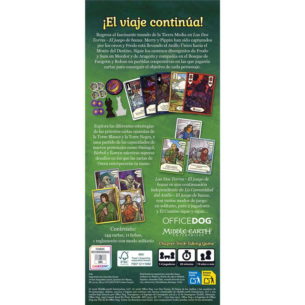 Regresa al fascinante mundo de la Tierra Media en Las Dos Torres - El juego de bazas. Merry y Pippin han sido capturados por los orcos y Frodo está llevando el Anillo Único hacia el Monte del Destino. Sigue los caminos divergentes de Frodo y Sam en Mordor y de Aragorn y compañía en el Bosque de Fangorn y Rohan en partidas cooperativas en las que jugaréis cartas para conseguir el objetivo de cada personaje. Las Dos Torres - El juego de bazas es una continuación independiente de La Comunidad del Anillo - El juego de bazas, con varios modos de juego.