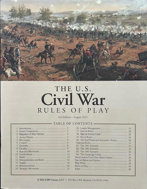 The U.S. Civil War es un juego de guerra a nivel estratégico para 2 jugadores de la Guerra Civil Estadounidense. Un bando controla el Norte (la Unión), el otro el Sur (la Confederación). El Sur intenta defender su nación y acabar con la voluntad del Norte de continuar la guerra; el Norte intenta aplacar la rebelión. El juego cubre toda la guerra desde 1861 hasta 1865 en un gran área de mapa de 30” x 44” (2 mapas montados) del sureste de los Estados Unidos. Los turnos representan 3 meses durante el invierno y 2 meses durante el verano, con cuatro Fases de Acción en cada turno. Las fuerzas militares están representadas por generales y puntos de fortaleza (SP). Cada SP representa aproximadamente 5.000 soldados. La mecánica del juego enfatiza la estrategia, la maniobra y el liderazgo, pero se incluyen detalles como acorazados, batallas navales, ascensos de líderes, fuertes y asaltantes comerciales.