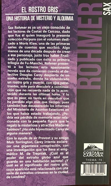 Sax Rohmer es ya un viejo conocido de los lectores de Costas de Carcosa, dado que fue él quien inauguró la presente colección Púrpura con el volumen dedicado a Moris Klaw, una de las primeras series de cuentos que escribió. Algo menos de una década después de crear a ese personaje, justo tras haber finalizado y publicado con éxito su primera trilogía de Fu-Manchú, Rohmer presentó a los lectores esta apasionante novela que da comienzo cuando el detective Douglas Carey despierta de un sueño extraño, donde ha vislumbrado un rostro gris y muerto, con ojos penetrantes, solo para descubrir a continuación que no recuerda nada de lo acontecido durante las últimas horas. Y lo que es peor, no tarda en descubrir que ha perdido algo más que tiempo, pues también han desaparecido los informes del Ministerio de Asuntos Exteriores en los que había estado trabajando.