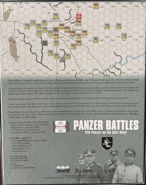 Panzer Battles: 11th Panzer on the Chir River es un juego de la serie Standard Combat Series (SCS) de Multi-Man Publishing que recrea las clásicas batallas defensivas móviles del río Chir, protagonizadas por la 11.ª División Panzer alemana contra las puntas de lanza decisivas de la Operación Urano soviética. Los soviéticos han logrado cercar la bolsa de Stalingrado y están reforzando su cerco.