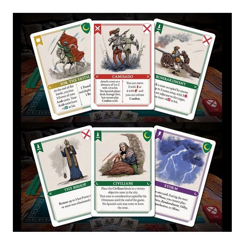 Las cartas son el motor del juego: activan unidades para mover y atacar y permiten acciones especiales como las encamisadas del jugador español. No hay un número fijo de turnos; el otomano dispone de tiempo para preparar el asedio, mientras el tercio de Sarmiento intenta frustrar sus planes.