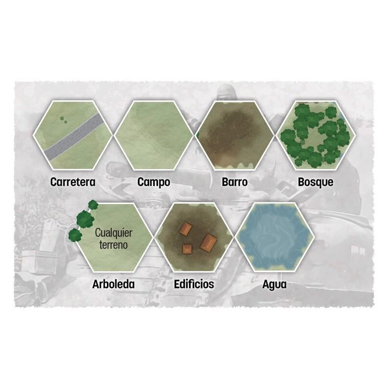 - Cada escenario cuenta con un mapa con rejilla hexagonal y unas instrucciones de despliegue de las unidades del jugador y de la IA y su comportamiento.