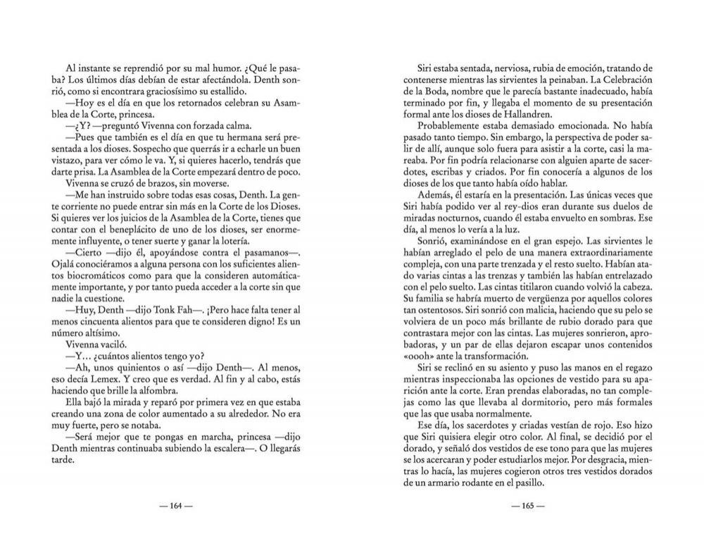 Hace años, el monarca de Idris firmó un tratado con el reino de Hallandren según el cual el rey Dedelin enviaría a su hija mayor, Vivenna, para casarse con Susebron, el rey-dios de Hallabdren. Vivenna ha sido adiestrada durante toda su vida para ser una novia adecuada para Susebron y así cumplir con su deber y ayudar a forjar una paz estable entre los dos reinos. Ese era el plan, pero el monarca de Idris envía a su hija Siri, desobediente e independiente, en lugar de Vivenna. Nueva edición de El aliento de los dioses, una rara avis del Cosmere, con las ilustraciones a color de la edición de piel de Dragonsteel.